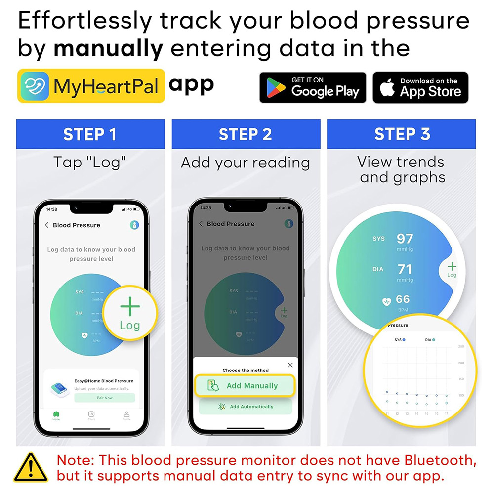 - 2 Users & 120 Memory on the Monitor, Unlimited with App: The monitor can store up to 120 measurements, with 60 records per user. Plus, with the free MyHeartPal app, you can easily track and store unlimited blood pressure readings on your smartphone. You can also share reports with your family or doctor and sync data with Apple Health. Note: This monitor is not Bluetooth-enabled; data must be manually entered into the app
