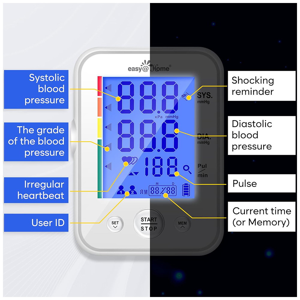 - Easy to Use: The blood pressure monitor features a large backlit display that provides clear and easy-to-read measurements. Simply press the start button, and the cuff will automatically inflate to measure your blood pressure and heart rate. It intelligently averages the last 3 readings for more accurate results over time, making it ideal for regular tracking of blood pressure